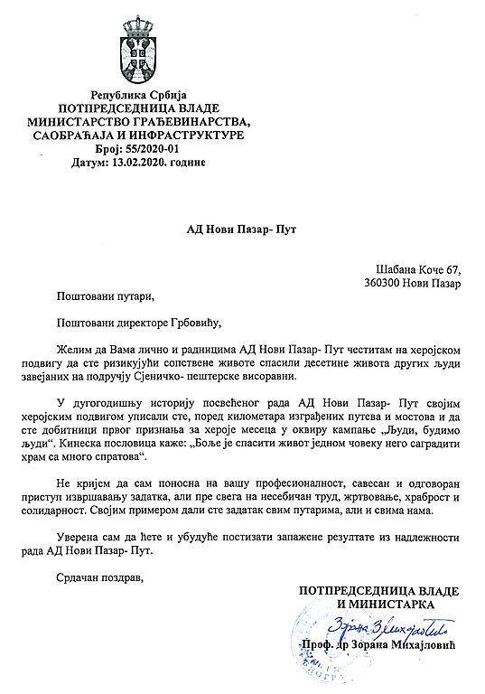 Nakon jučerašnjeg prijema kod gradonačelnika Novog Pazara i dobijanja Nagrade i priznanja za herojstvo, naši radnici dobili su još jedno priznanje, i to od strane Potpredsednice Vlade i Ministarke građevinarstva, saobraćaja i infrastrukture, Zorane Mihajlović.