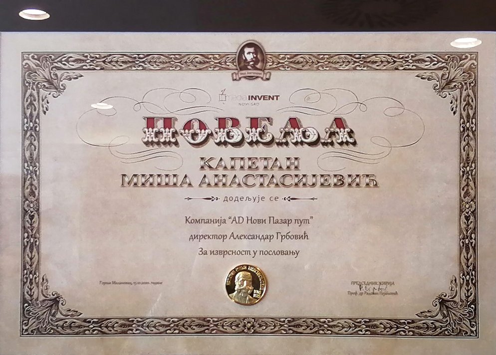 Ovo je drugi put da naše preduzeće dobija nagradu "Kapetan Miša Anastasijević". Prethodni put je to bilo 2009. godine.