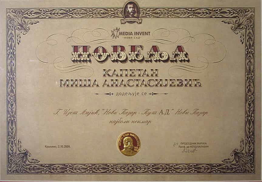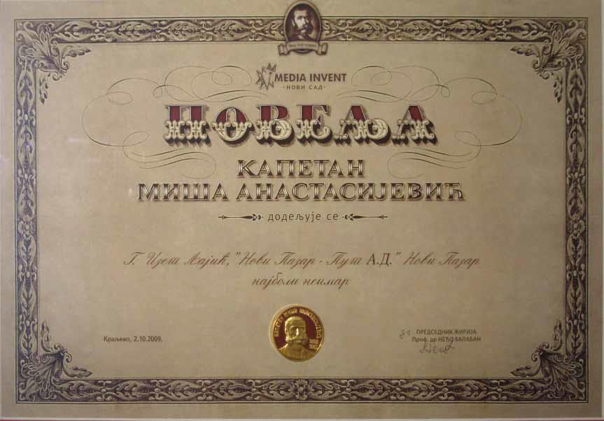 - Iste godine (2009) smo dobili povelju "Kapetan Miša Anastasijević" od strane Media Invest Novi Sad.